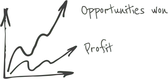 Scenario: Total deals won is increasing, but total profit is not matching. Essentially, youโ€™re winning more work, but not creating much more money as the total value of those deals is low.